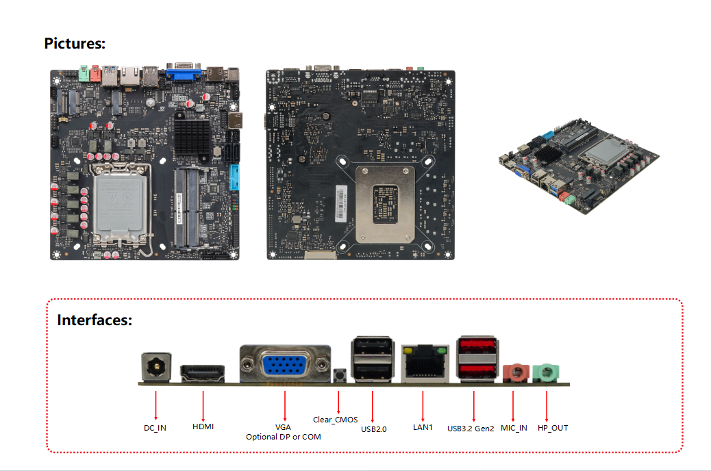 | CPU | Intel®Alder Lake & Raptor Lake Processor | Rear I/O | 1*DC_IN 1*HDMI 1*VGA (Optional DP) 1*Clear_CMOS 2*USB2.0 1*LAN1 2*USB3.2 Gen2 1*MIC_IN 1*HP_OUT |