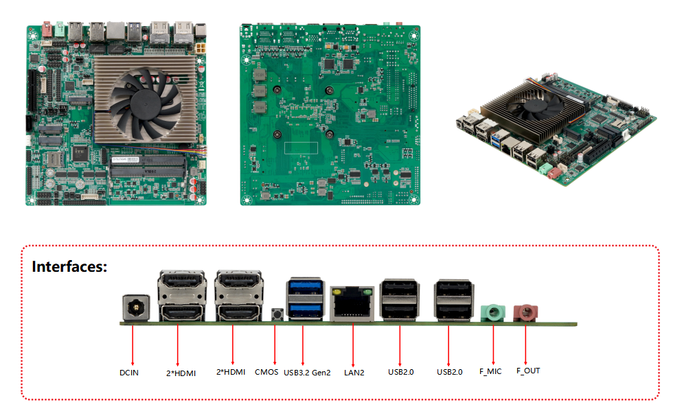 | Independent amplifier NS4251 3W@4Ω MAX | Internal I/O | 1*F_AUDIO pin 1*Speaker pin 3*F_USB (expandable 5*USB2.0) 1*LVDS pin 1*EDP pin 1*INVCN pin 1*PCIEX4 expansion slot 1*SATA pin 1*SATA_PWR pin 1*LPT pin 6*COM pin 1*TPM pin 1*F_PANEL pin 1*SYS_FAN pin 1*CPU_FAN pin 1*ATX socket |