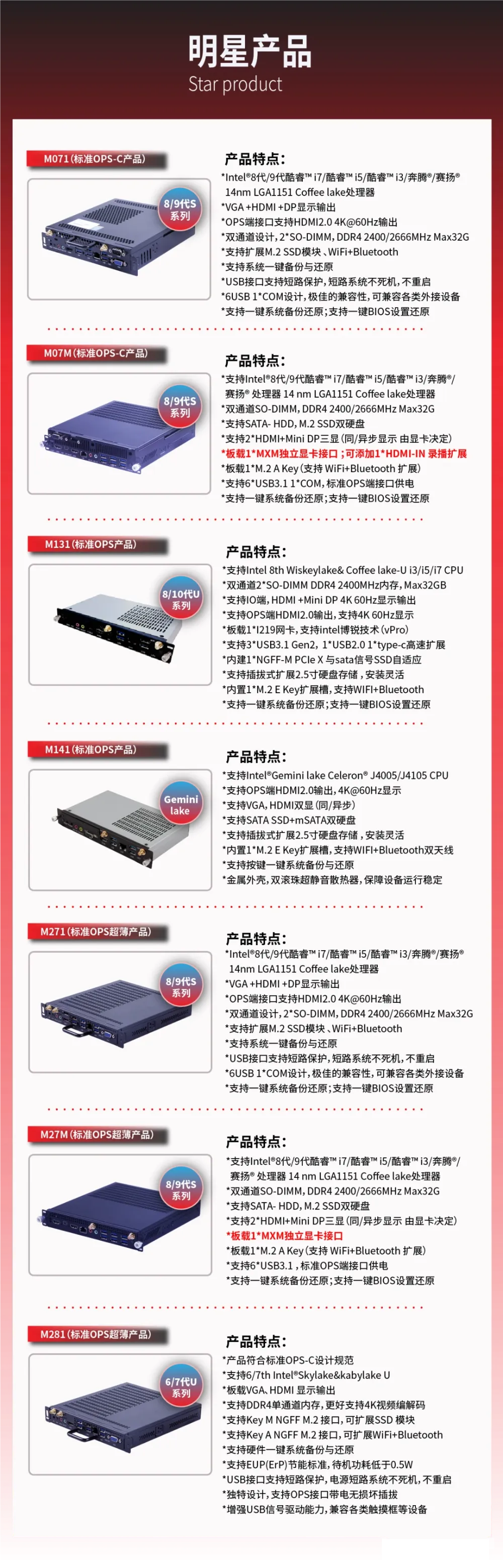 针对行业高端客户对产品硬件性能的需求,凌壹科技以智能硬件为基础,率先发布基于coffee lake(refresh)平台支持独立显卡,主推型号:M07M、M27M(可选配GTX1050/1030/750等显卡)。