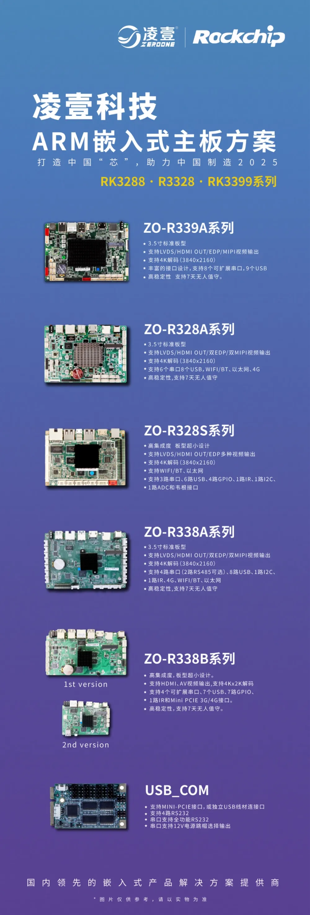 基于ARM平台,凌壹科技组建了一只专业的产品研发队伍,并与瑞芯微达成战略合作伙伴关系,并率先推出了一系列国产化成熟单板及整机产品,为客户提供一站式产品研发服务。产品应用行业涉及:多媒体广告机、收银POS机、互动数字标牌、触摸一体机、工控机、人脸识别终端、自助售货机、机器人、医疗设备等。