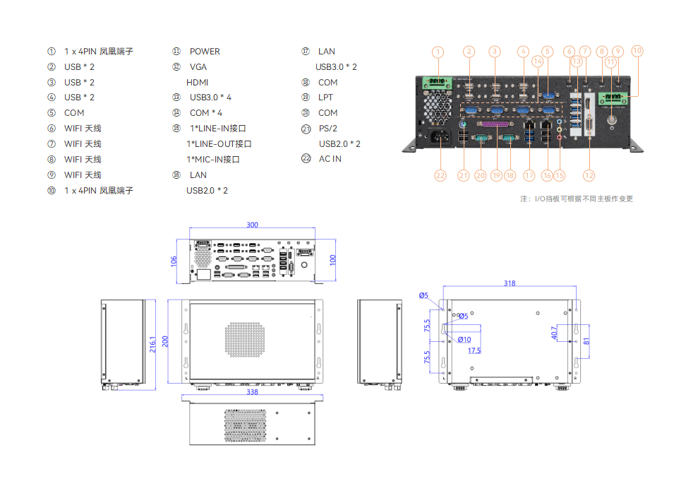 1*开机按键(带LED) 4Pin凤凰端子;开关、电源指示灯的引出 1*VGA端口 1*HDMI端口 4*USB3.2端口 6*USB2.0端口 5*COM232端口 4Pin凤凰端子;12V、5V供电 1*LINE-IN接口 1*LINE-OUT接口 1*MIC-IN接口 1*LAN 端口 |