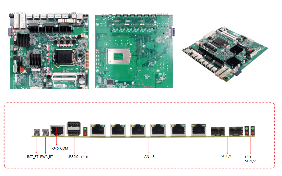 | 处理器 | Intel®Ivy Bridge赛扬G1610/G1620等 Processor | 后置I/O接口 | 1*RST_BT按键 1*PWR_BT按键 1*RJ45_COM端口 2*USB2.0端口 1*开关和硬盘指示灯 6*LAN端口 2*SFP光纤口 2*SFP状态指示灯 |
