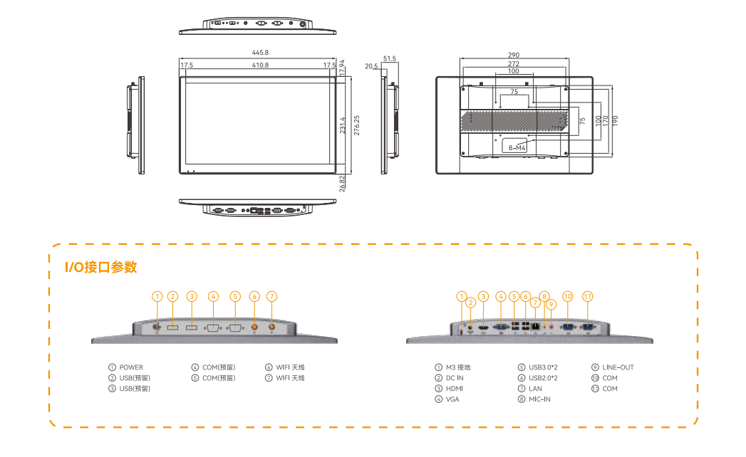 | 产品型号 | PPC-1911 | 指示灯 | 屏下预留电源状态指示灯 | 整机尺寸 | 446x276x52mm |