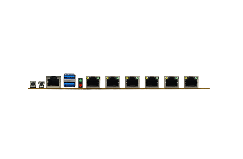 | 处理器 | Intel® Alder Lake-N(N100/N95/N305)处理器 | 后置I/O接口 | 1*RST按钮(重启功能,可切换GPIO触发功能) 1*PWR按钮 (开关机) 1* RJ45_COM端口 2*USB3.0(待机电) 1*LED指示灯(电源绿灯,硬盘红灯) 6*LAN端口 前面板: 1*DC_IN端口 |