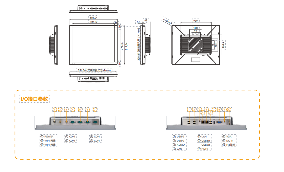 1*Audio端口 1*DP端口 1*HDMI端口 4*USB3.2端口 2*LAN 端口 1*DC IN端口 4*USB端口 1*M3接地螺孔 |