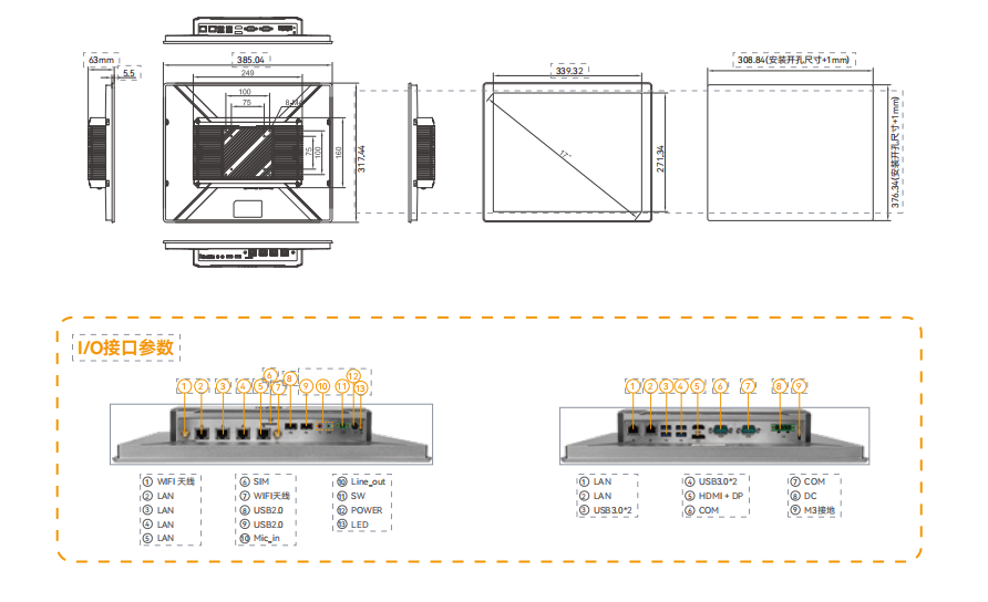 | 下I/O接口 | 1*LAN 端口 4*USB3.1端口 1*HDMI端口 1*DP端口 2*COM 1*DC IN端口,4pin凤凰端子 1*M3接地螺孔 1*RST按键, 1*REC按键,系统还原 |