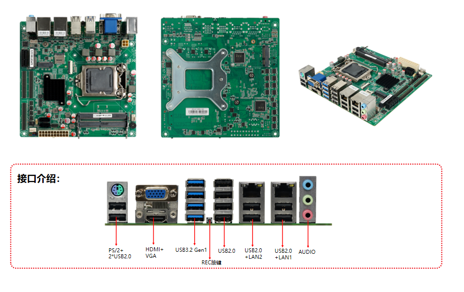 | 显示输出 | EDP+HDMI+VGA | 1*REC按钮(支持系统一键还原和清CMOS) | |