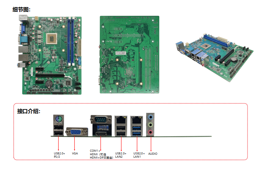 | 显示输出 | HDMI+VGA+DP | 1*LAN2+2*USB2.0 三层座端口 | |
