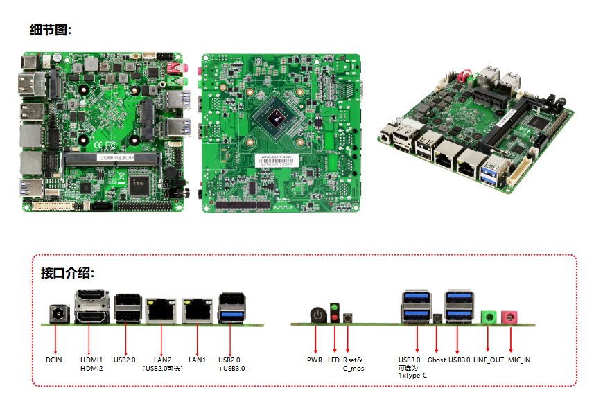 | USB | 5*USB3.2 GEN1(5Gbps)+5*USB2.0 | 前置I/O接口 | 1*PWR_BT按键 2*LED 1 x硬盘指示灯(红) ;1 x WIFI&4G模块数据状态指示灯(绿) 1*Rset&CLR_CMOS按键 1*SIM卡槽可选(默认未上件) 2*USB3.0接口(可选1*Type-C接口) 1*Ghost按键 2*USB3.0接口 1*LINE-OUT接口 1*MIC-IN接口 |